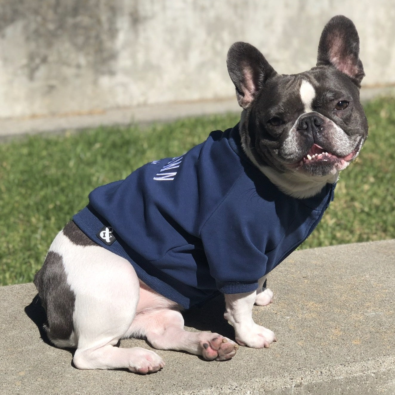 Pictured: Brie (white frenchie) is ~21lbs and wearing a size small. Mila (blue pied frenchie) is ~26lbs and wearing a size medium.